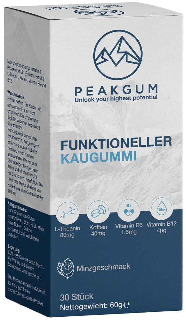 PeakGum kombiniert 40 mg Koffein mit 80 mg L-Theanin im wissenschaftlich untersuchten 2:1-Verhältnis. L-Theanin wirkt ausgleichend und reduziert typische Koffein-Nervosität.